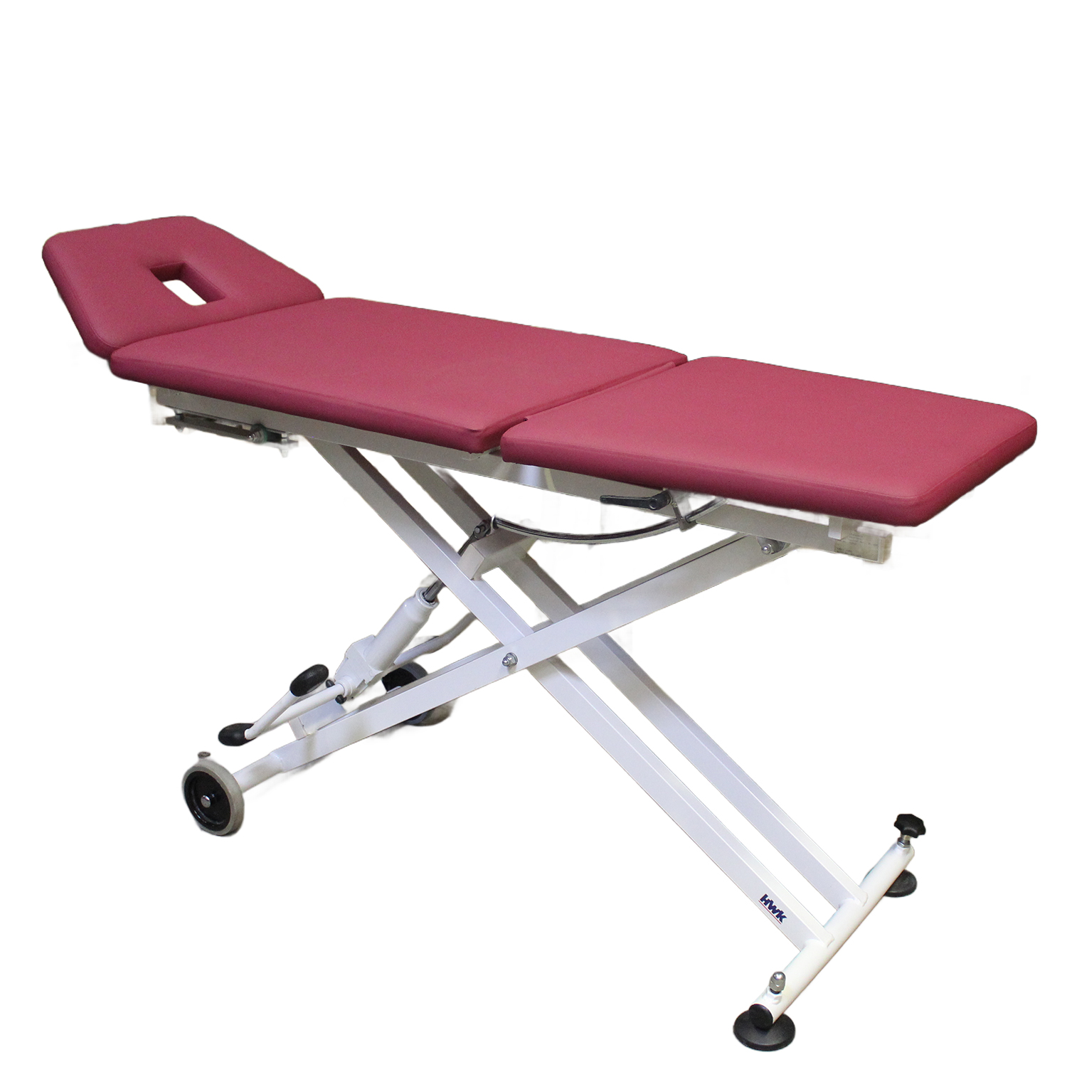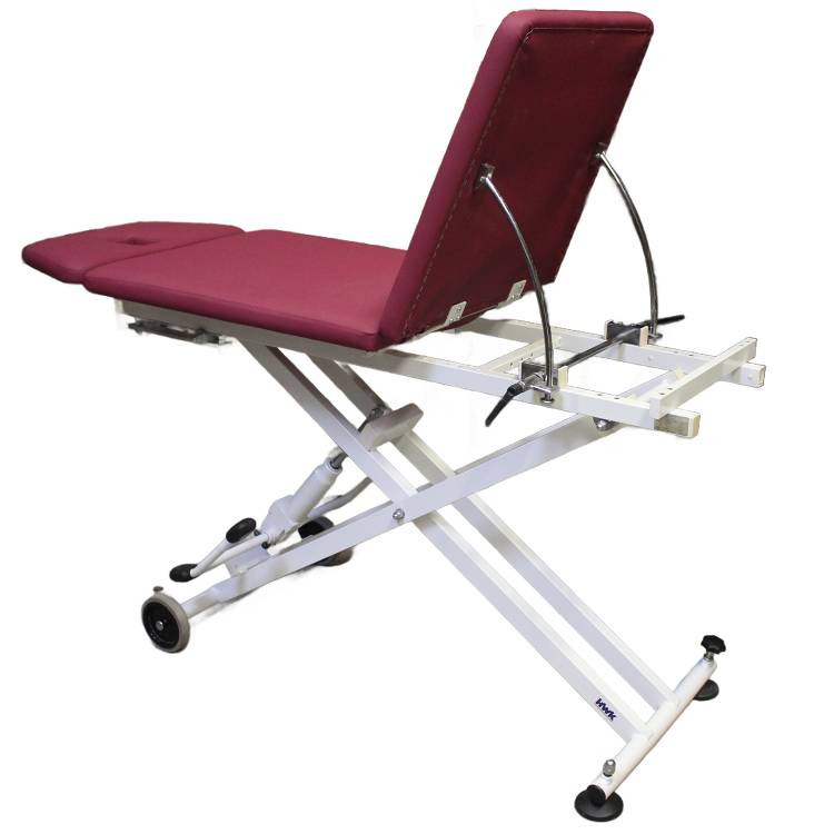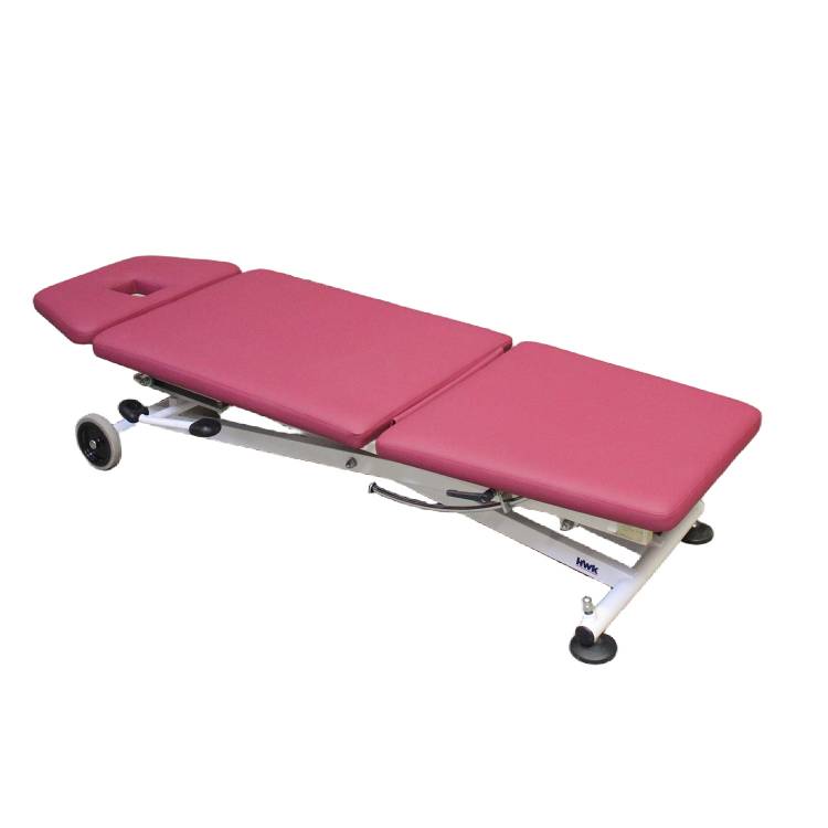 Hydraulisch höhenverstellbare Behandlungsliege mit neuer Beere-farbenden Polsterung. Besonders komfortabler Einstieg dank einer niedrigen Höhe von ca. 40 cm. Somit ideal für den Rehea- und Seniorenbereichgeeignet. Die 3-teilige Liegefläche mit seinem aufstellbaren Fußteil bietet vielseitige Therapiemöglichkeiten. Das Kopfteil stufenlos von +30° bis -45° verstellbar. Mit praktischem Schubkarrensystem (2 Räder) kann sie einfache im Raum verfahren werden.