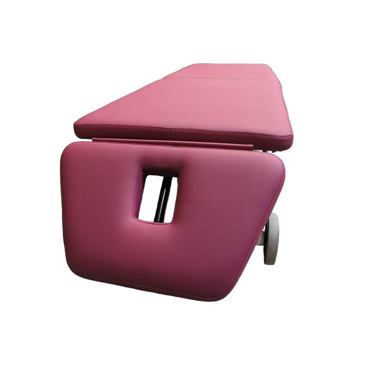 Auch optisch wirkt die Liege ansprechend und modern. Die beerefarbene Polsterung setzt einen freundlichen Akzent im Praxisraum und hebt sich angenehm von klassischen, rein funktionalen Behandlungsliegen ab. Das weiße Gestell sorgt gleichzeitig für einen sauberen, professionellen Gesamteindruck. So fügt sich die Liege sowohl in moderne Therapiezentren als auch in klassische Praxisräume harmonisch ein. Für viele Betreiber ist nicht nur die Funktion entscheidend, sondern auch die Atmosphäre des Behandlungsumfelds – und genau hier kann eine durchdacht gestaltete Therapieliege einen positiven Beitrag leisten.